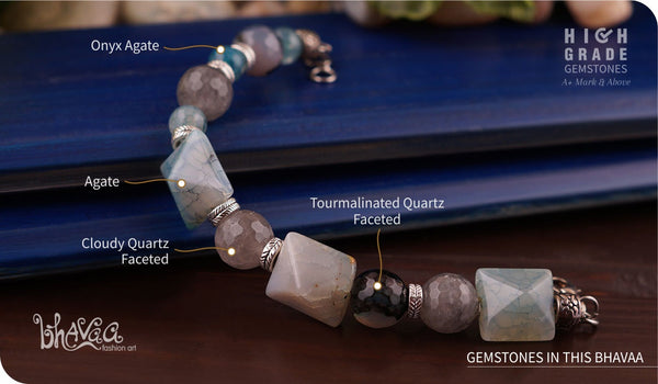 bhavaa Premium Gemstone Jewelry- Bracelet. Serene Indulgence Collection, Mark-2 | Gemstones: Blue Agate, Onyx Agate, Grey Cloudy Quartz Faceted, Grey Rutileted Quartz Faceted