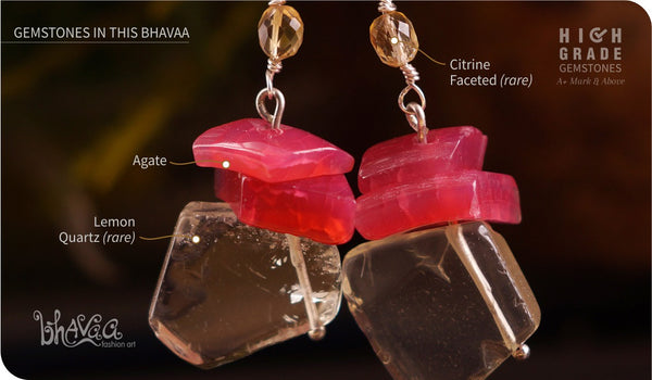 Gemstones:Yellow Lemon Quartz (rare) 16x26mmYellow Citrine Faceted (rare) 8mmPink Agate 5x16x28mmMetal Findings:Silver Plating Copper Base French Wire HookSpecifications:Length: 1.75" | Weight: 8.5 gms